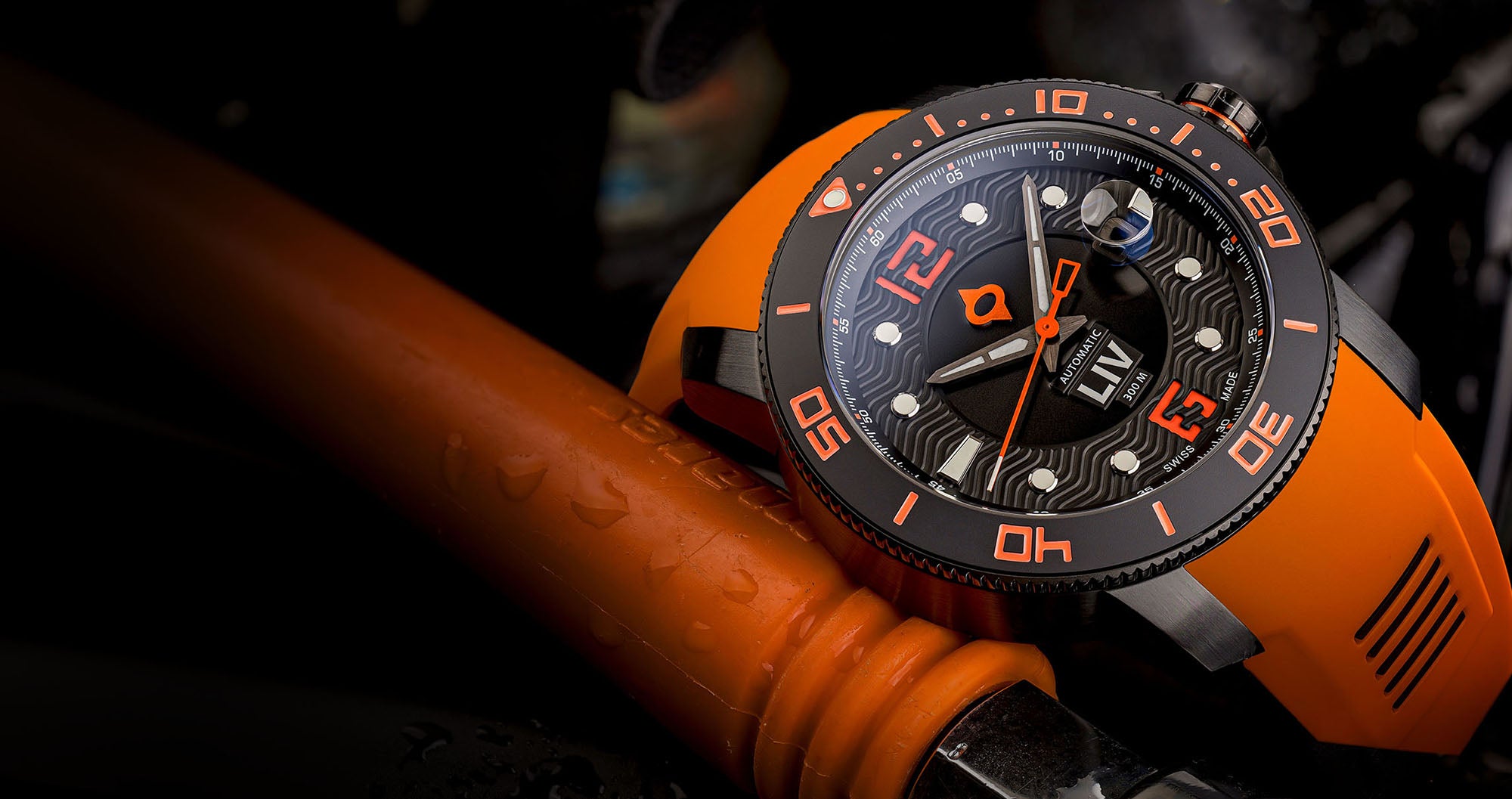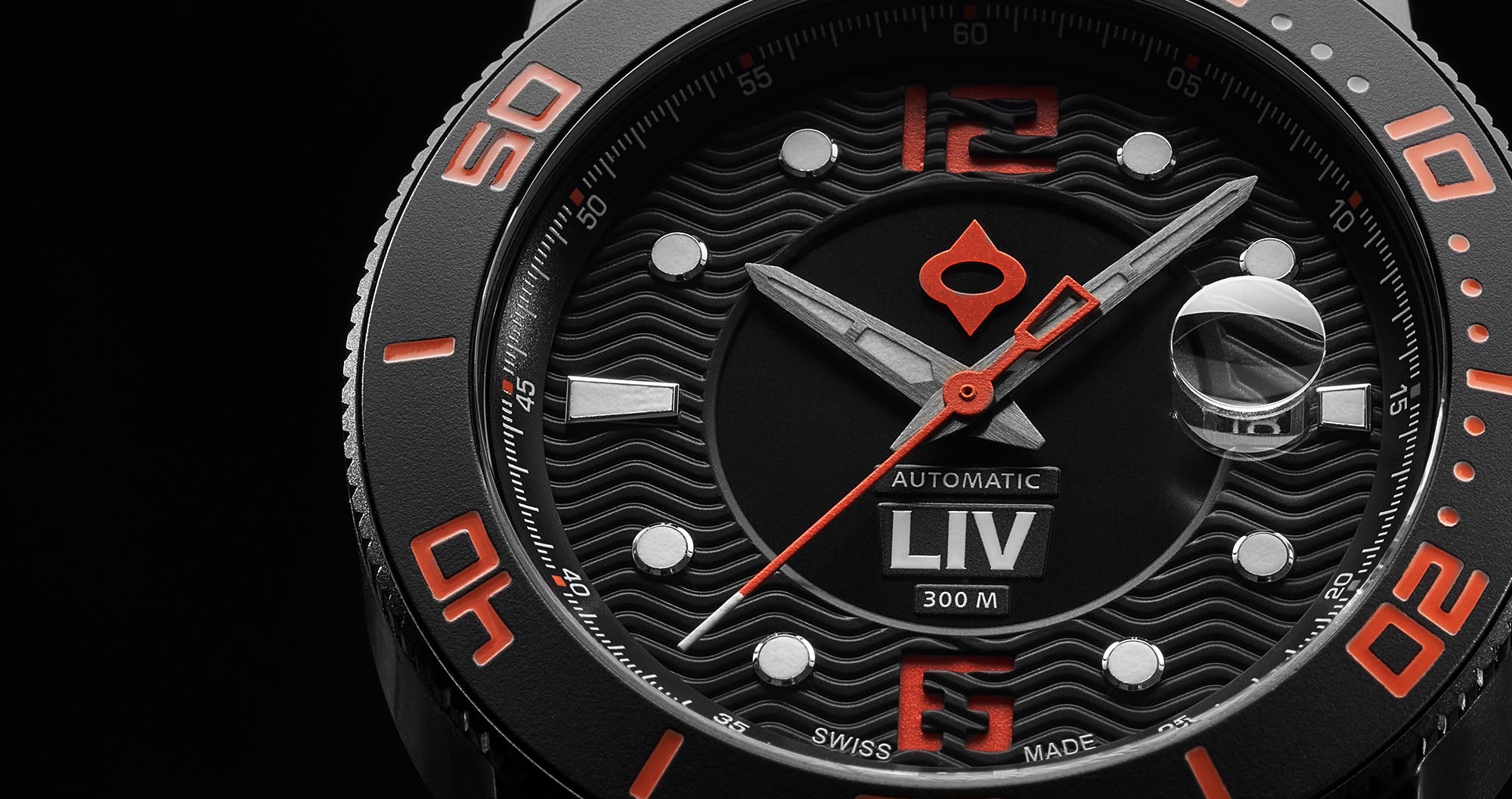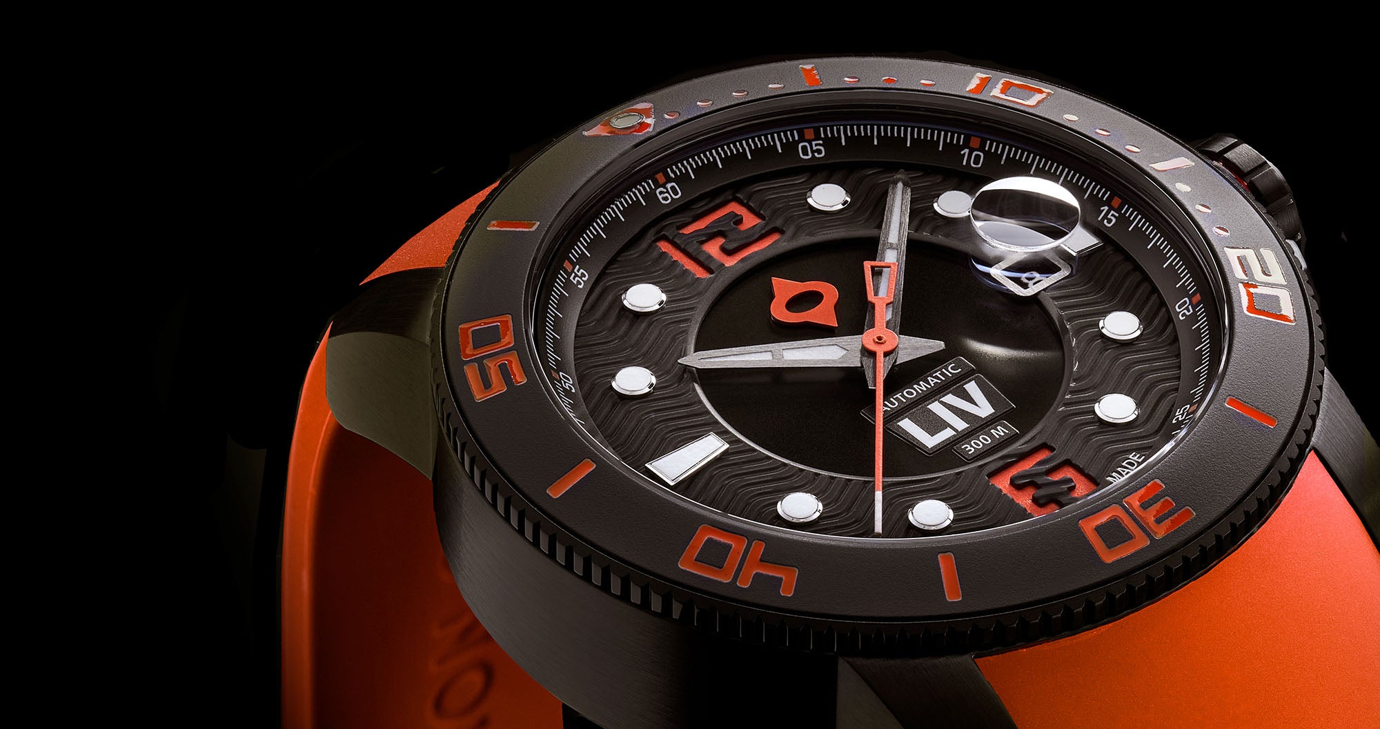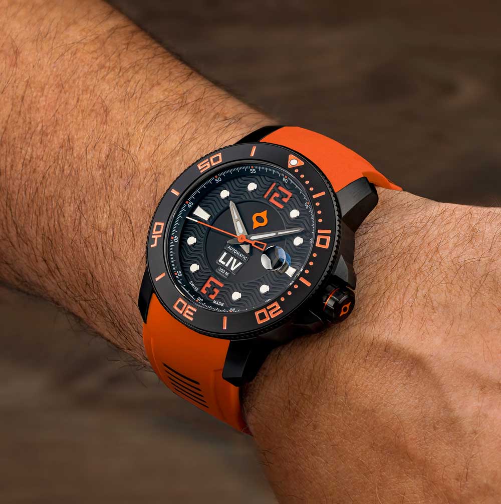 Surgical grade 316L stainless steel infused with black IP and skeleton case-back, unidirectional 120-click black ceramic bezel ring, and screw-down crown with LIV logo enamel