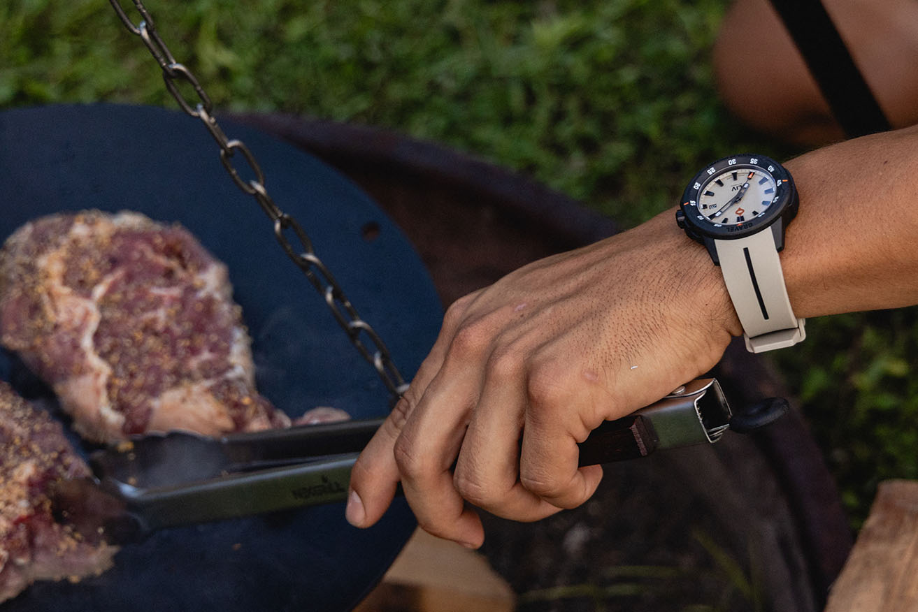 We use a mix of carbon fiber and polyamide that we call Dense Carbon. This case is super durable, tough, and light–the perfect watch case for the outdoor.