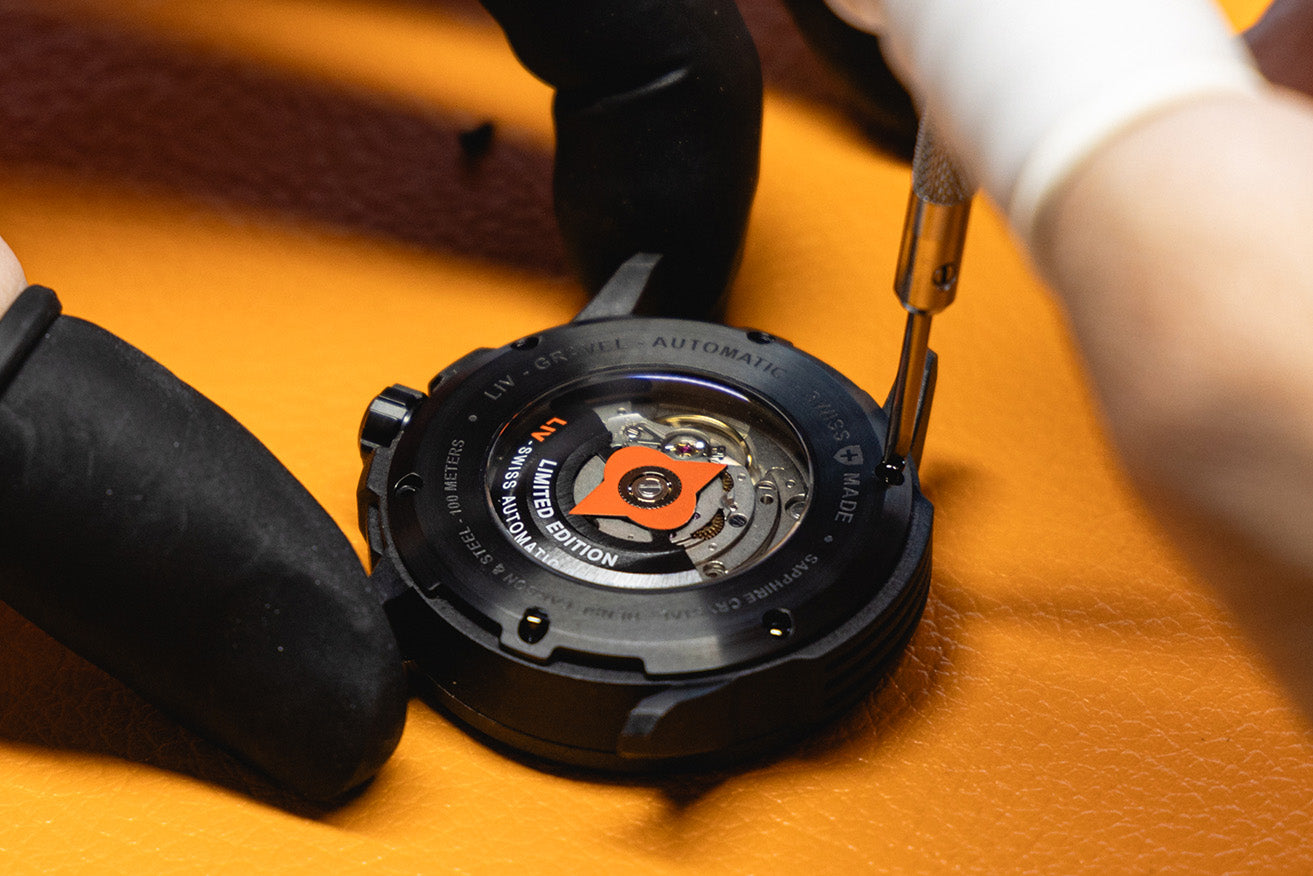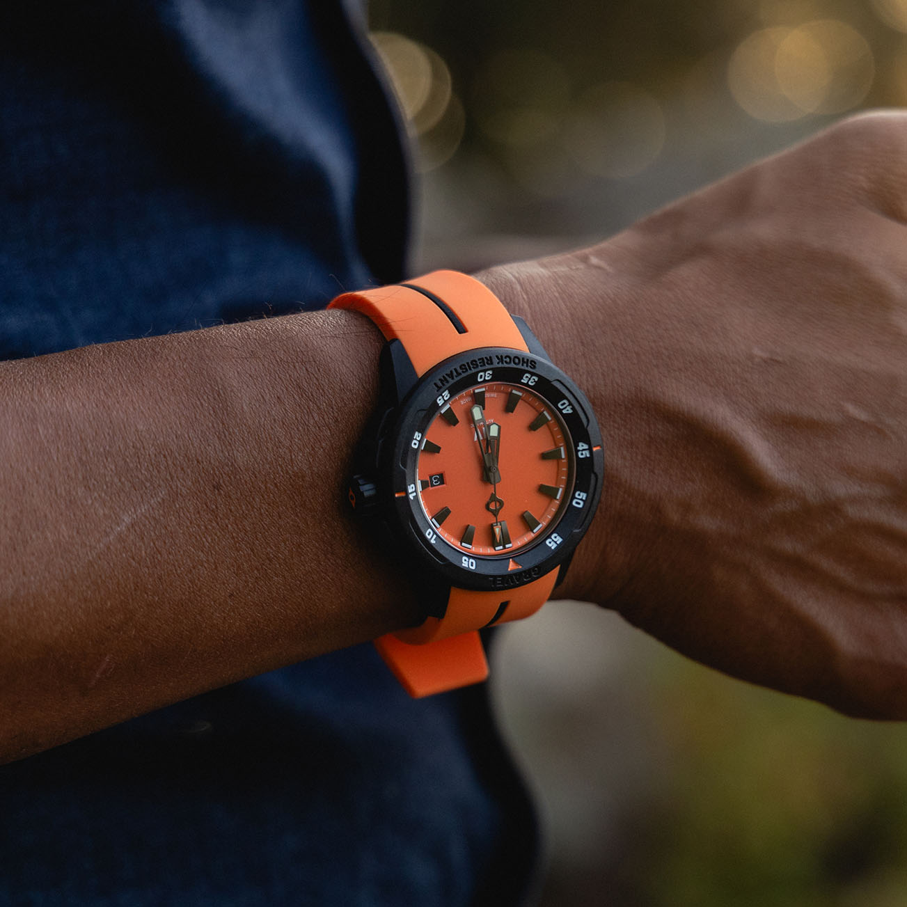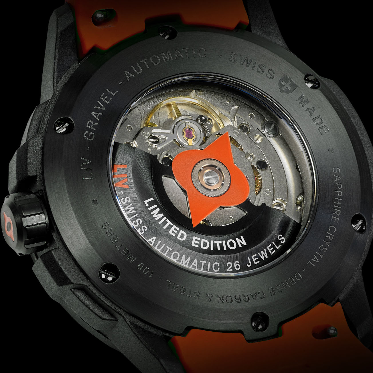 The GRAVEL 001 SIGNATURE ORANGE is powered by a 26-Jewel Swiss Automatic movement that has 42-hour power reserve and is certified to be accurate within +/- 5 sec per day.