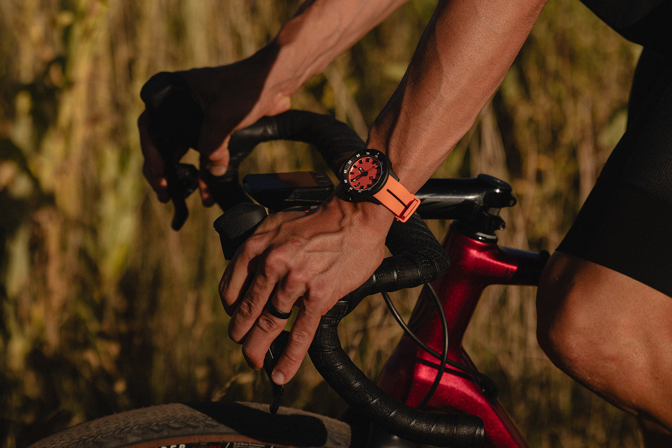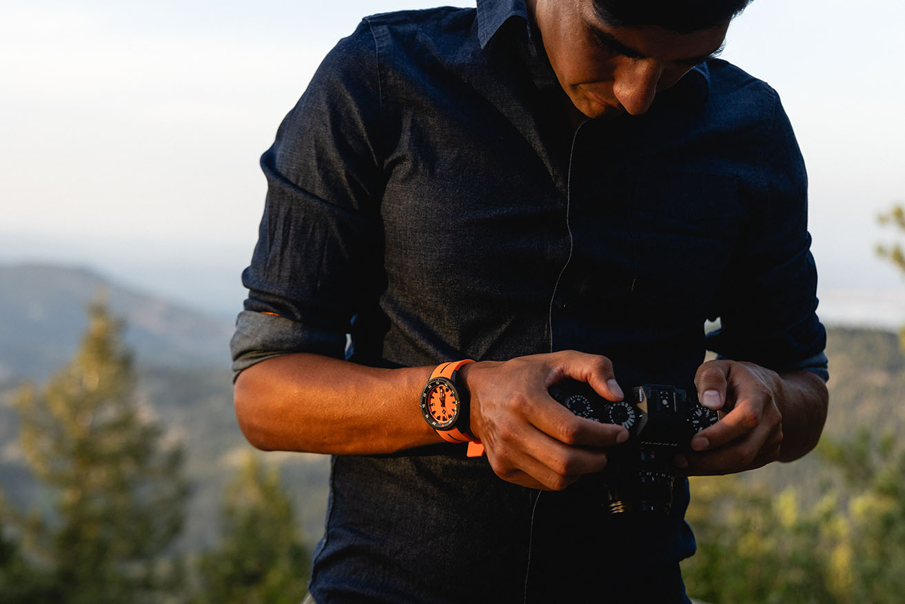 We use a mix of carbon fiber and polyamide that we call Dense Carbon. This case is super durable, tough, and light–the perfect watch case for the outdoor.