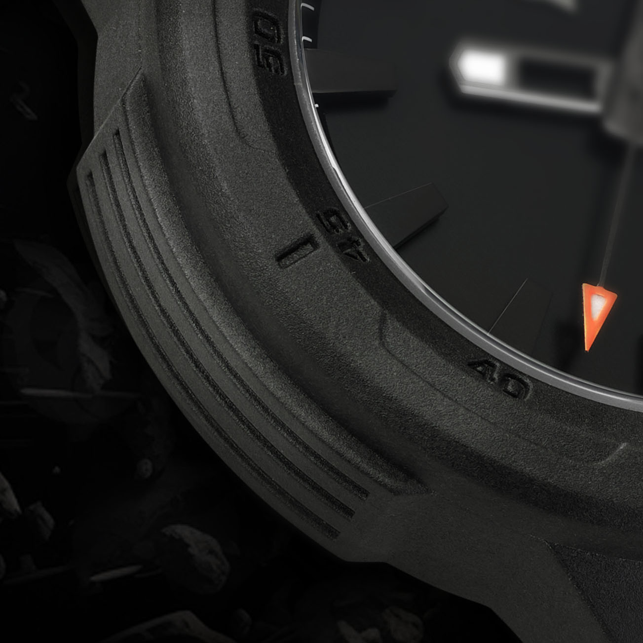 We use a mix of carbon fiber and polyamide that we call Dense Carbon. This case is super durable, tough, and light–the perfect watch case for the outdoor.