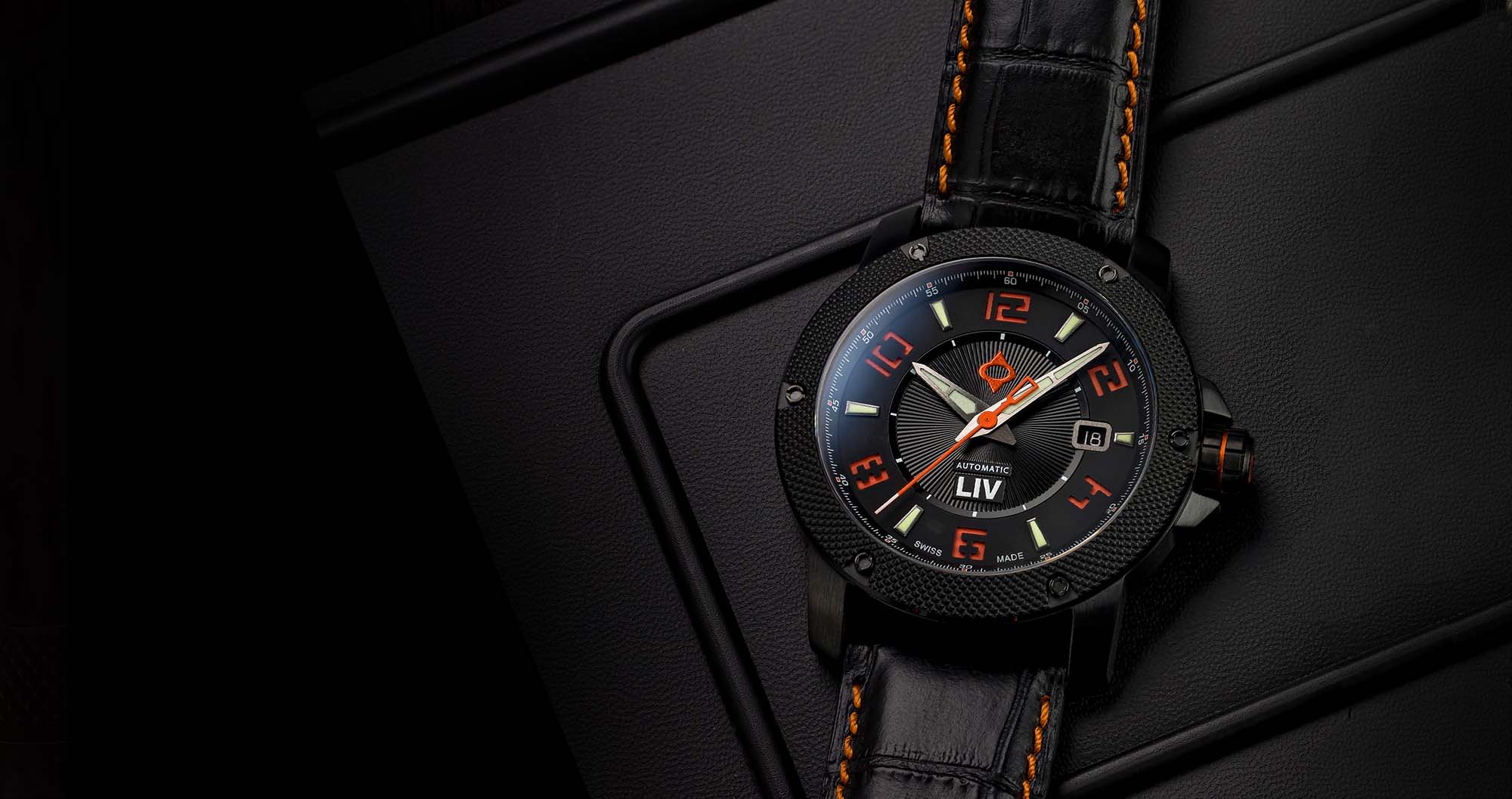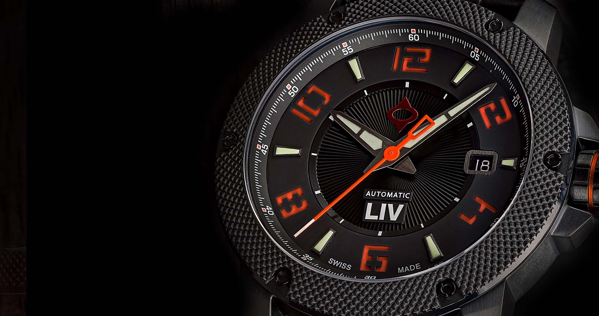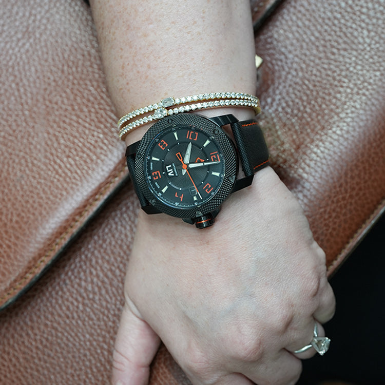 Surgical grade 316L stainless steel infused with black IP and skeleton case-back, knurled bezel with screws, and screw-down crown with LIV logo enamel