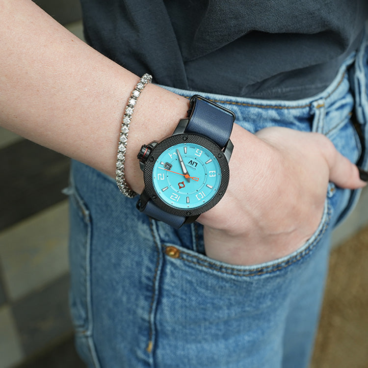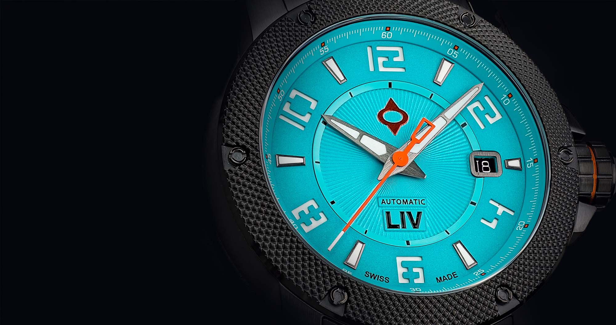 Surgical grade 316L stainless steel infused with black IP and skeleton case-back, knurled bezel with screws, and screw-down crown with LIV logo enamel
