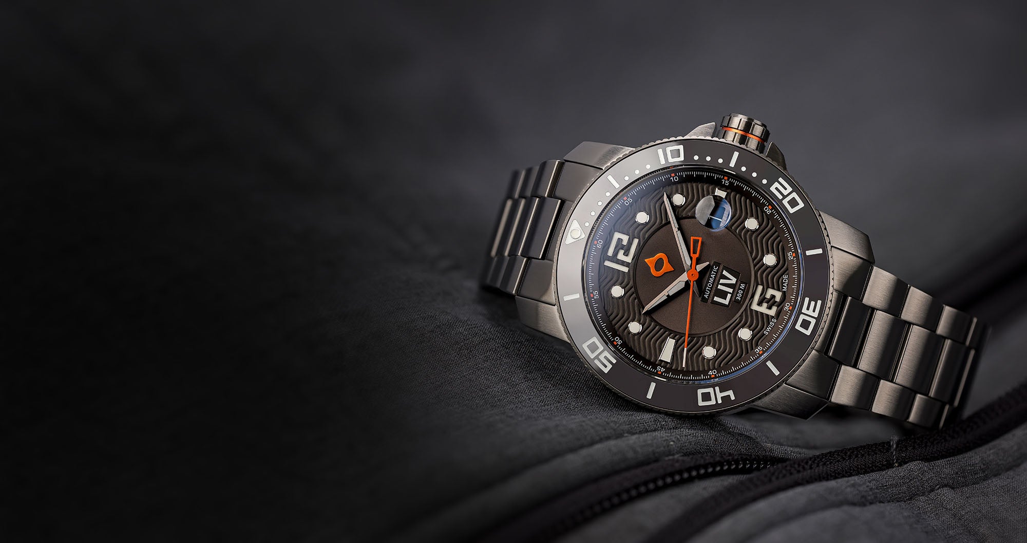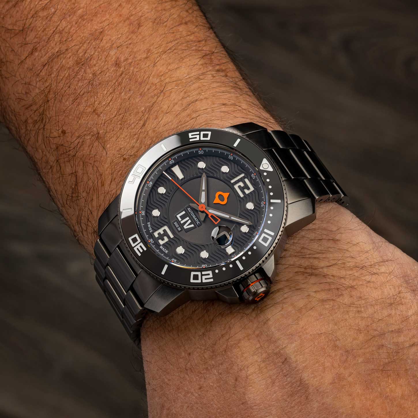 Surgical grade 316L stainless steel infused with gray IP and skeleton case-back, unidirectional 120-click gray ceramic bezel ring, and screw-down crown with LIV logo enamel