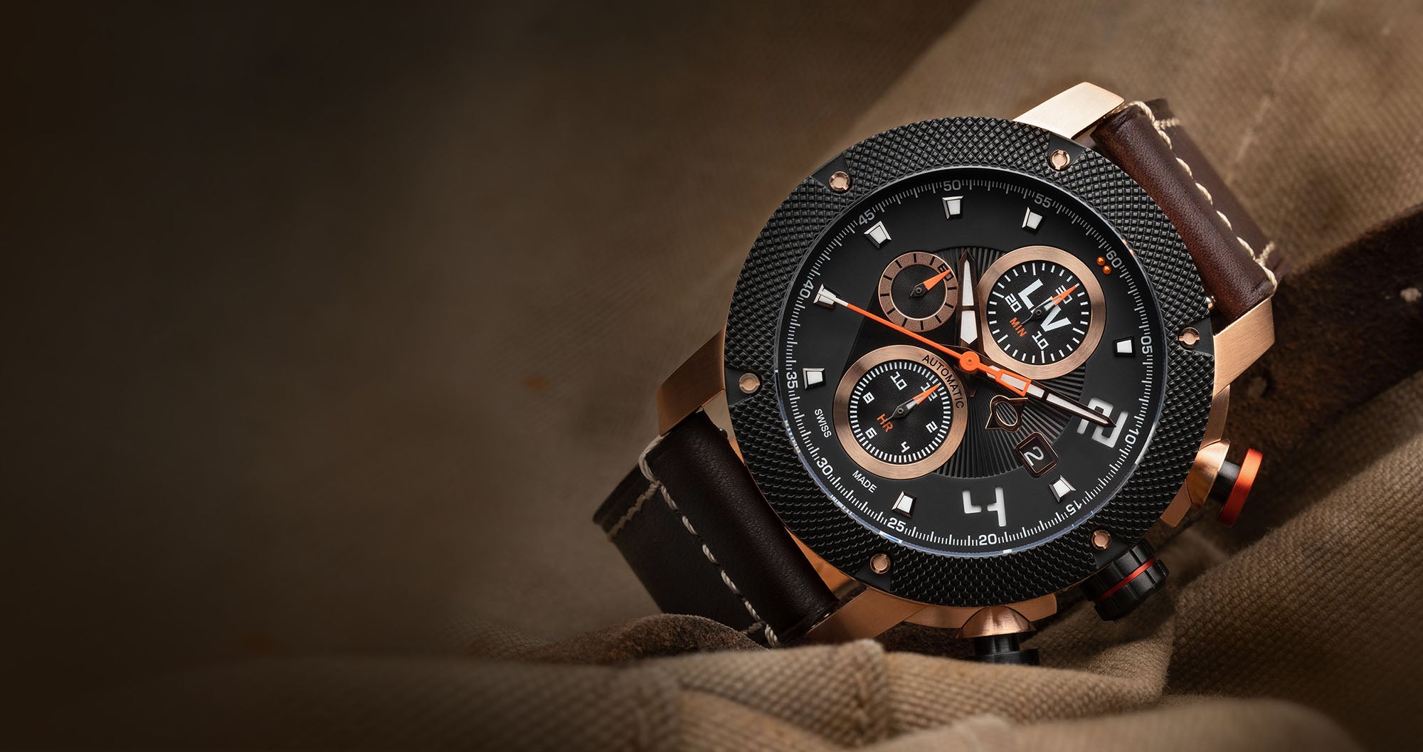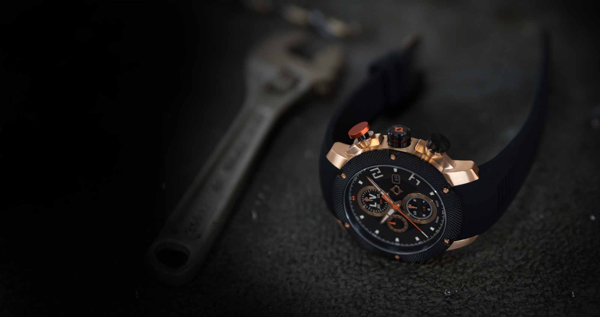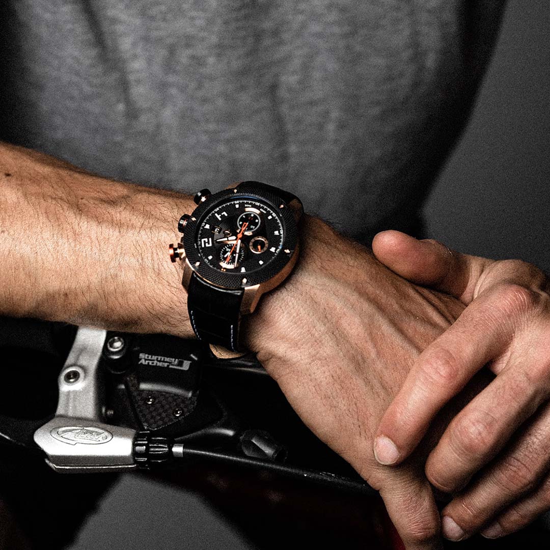 Surgical grade 316L stainless steel infused with rose IP and skeleton case-back, black knurled bezel with screws, and screw-down crown with LIV logo enamel