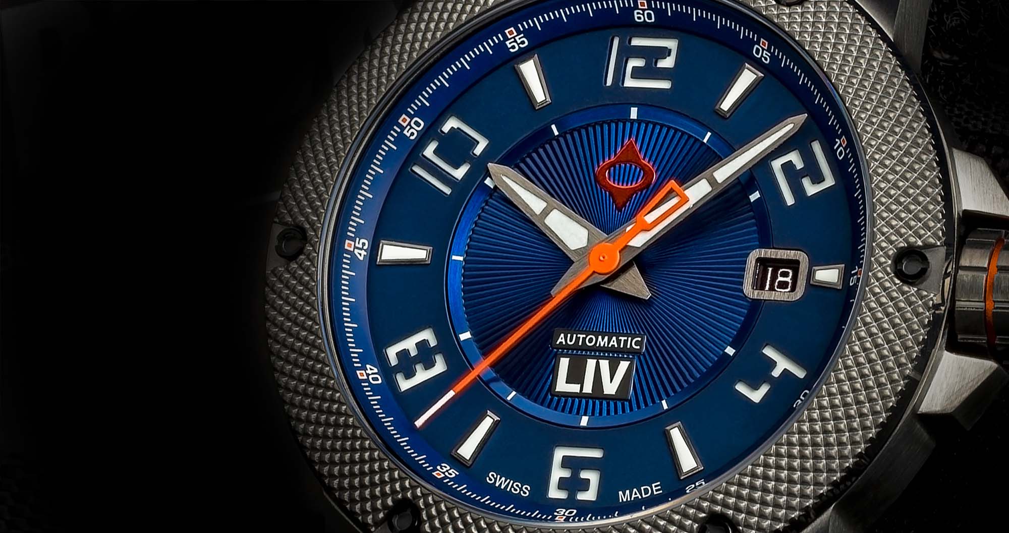 Surgical grade 316L stainless steel infused with gray IP and skeleton case-back, knurled bezel with screws, and screw-down crown with LIV logo enamel