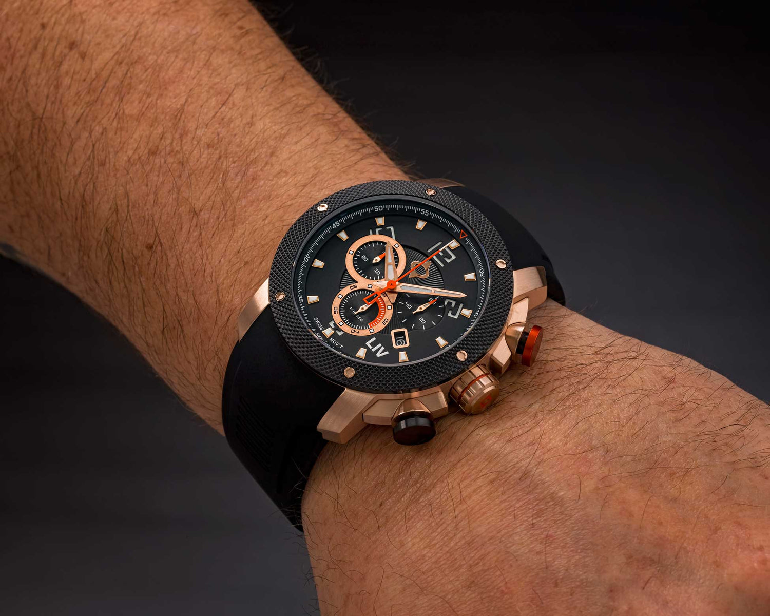 Surgical grade 316L stainless steel infused with rose IP for beautiful color and durability, screw-down case-back, black knurled bezel with screws, and screw-down crown with LIV logo enamel