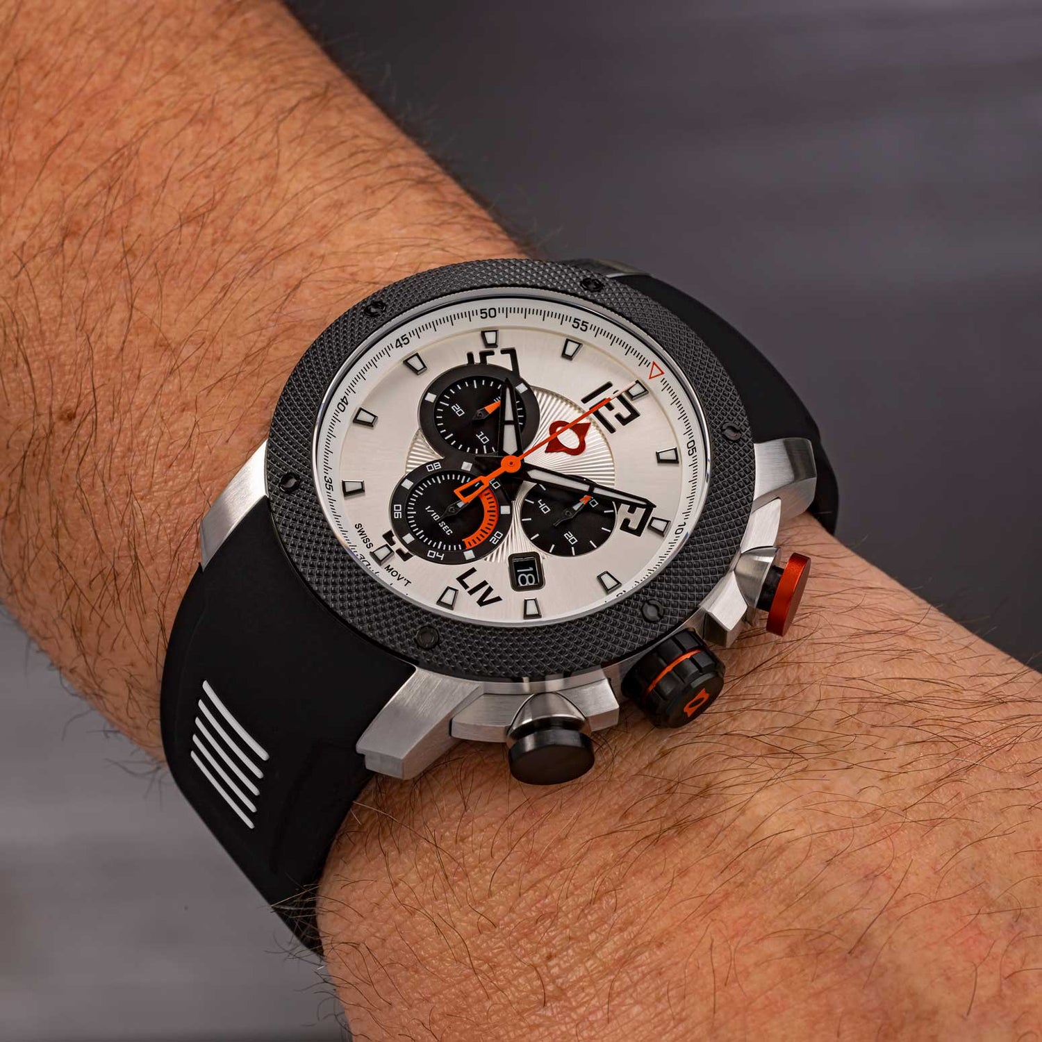 The LIV GX1 Dual Lume features a multi-layer full lume dial, a Swiss caliber 5040.D movement, a 1/10 of a second Swiss chronograph, knurled bezel with screws, a 316L stainless steel case, a scratch-resistant & anti-reflective sapphire crystal, a screw-down crown, and water-resistant to 200 meters.