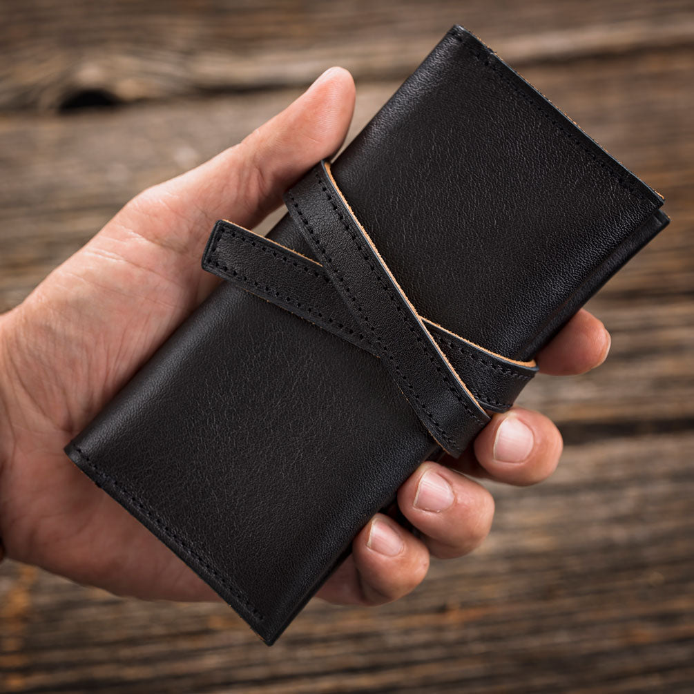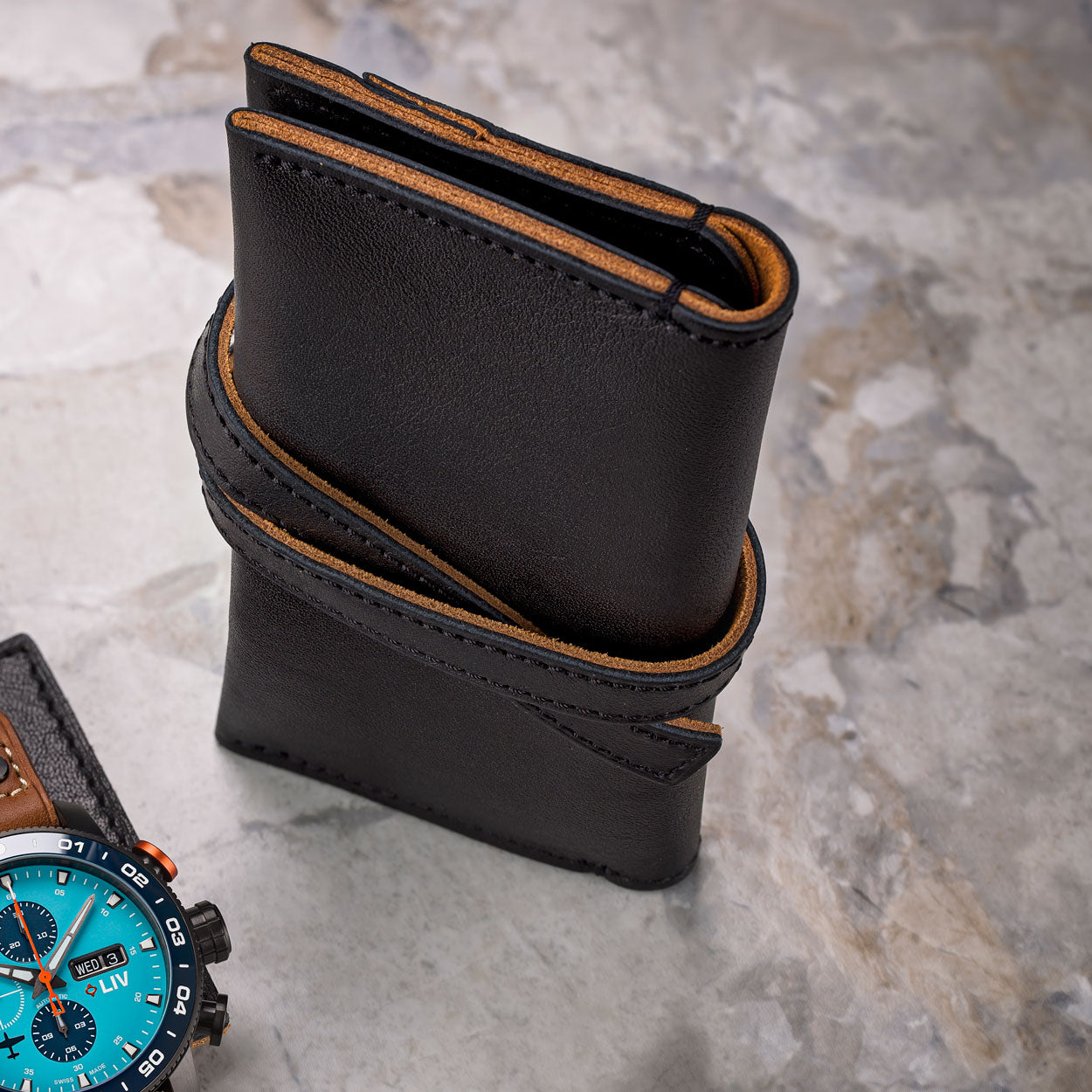 Stash away with confidence thanks to the soft and supple top-grain nappa leather. Protect your watches in style. Our black-stained, dual-treated top-grain leather roll offers surprising durability for your wildest journeys. Leather inserts ensure no clashing, and the security strap protects against accidental slip-outs. Neat, secure, and durable with extra room for your growing LIV collection.