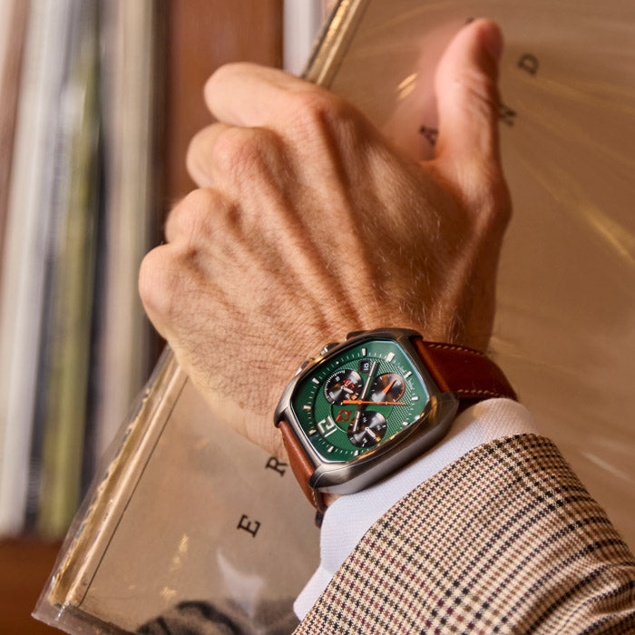 Stadium design multi-layer sandwich green dial, applied indexes, and steel sword-shaped hands with BGW9 luminescence