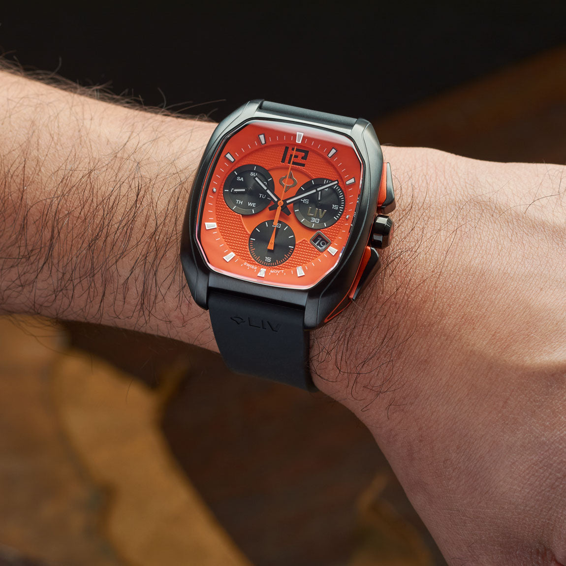 Stadium design multi-layer sandwich orange dial, applied indexes, and steel sword-shaped hands with BGW9 luminescence