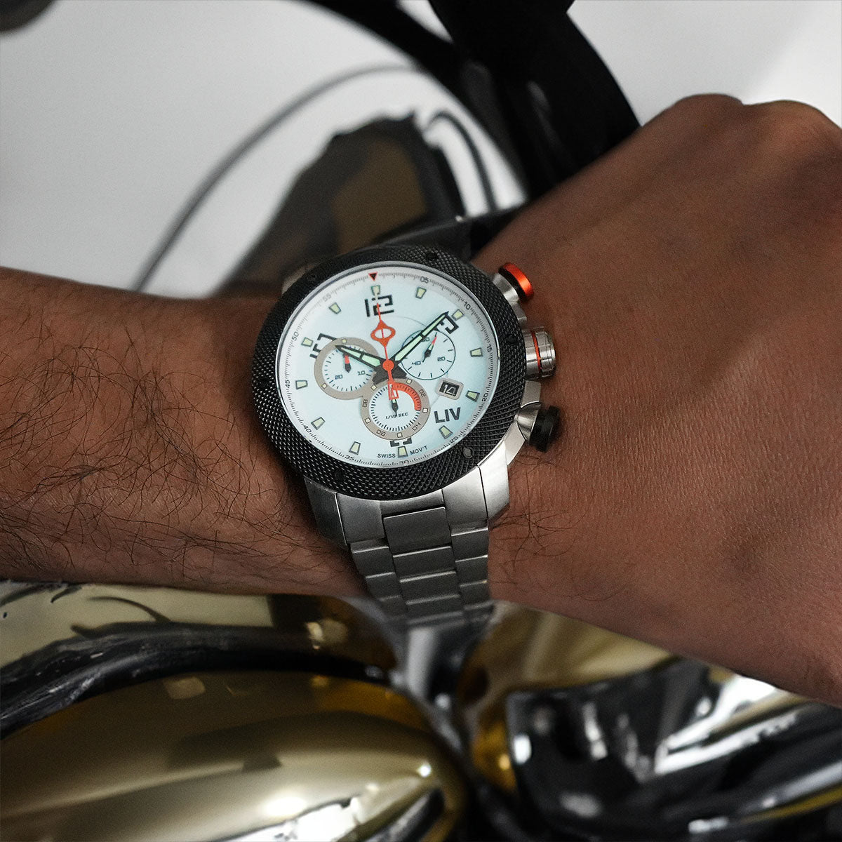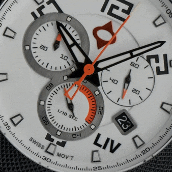 The LIV GX1 Dual Lume features a multi-layer white dial, a Swiss caliber 5040.D movement, a 1/10 of a second Swiss chronograph, knurled bezel with screws, a 316L stainless steel case, a scratch-resistant & anti-reflective sapphire crystal, a screw-down crown and water-resistant to 200 meters.