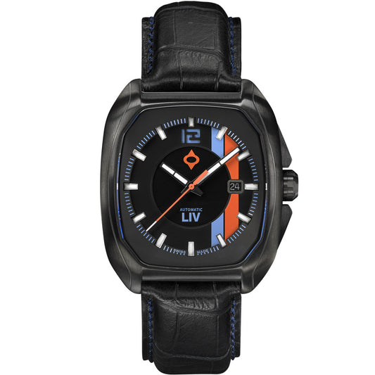 Embodies all the unique design features of the Rebel-AR but adds the precision Swiss automatic movement. The colored strips pays homage to the days of classic car racing.