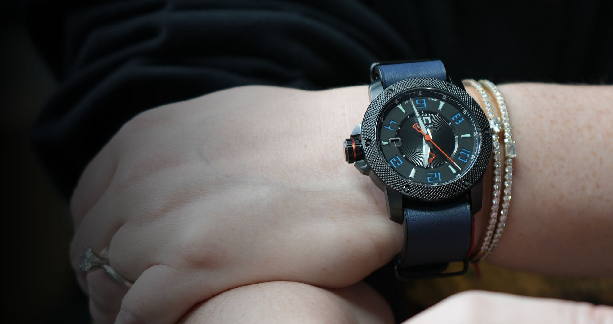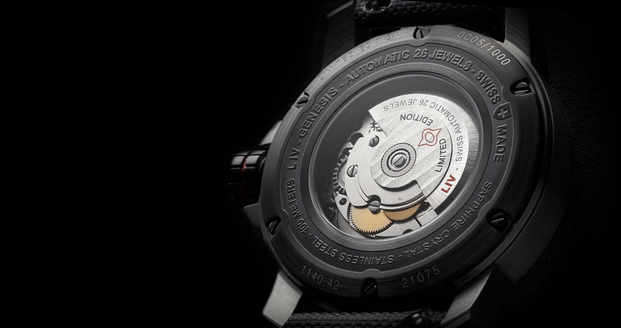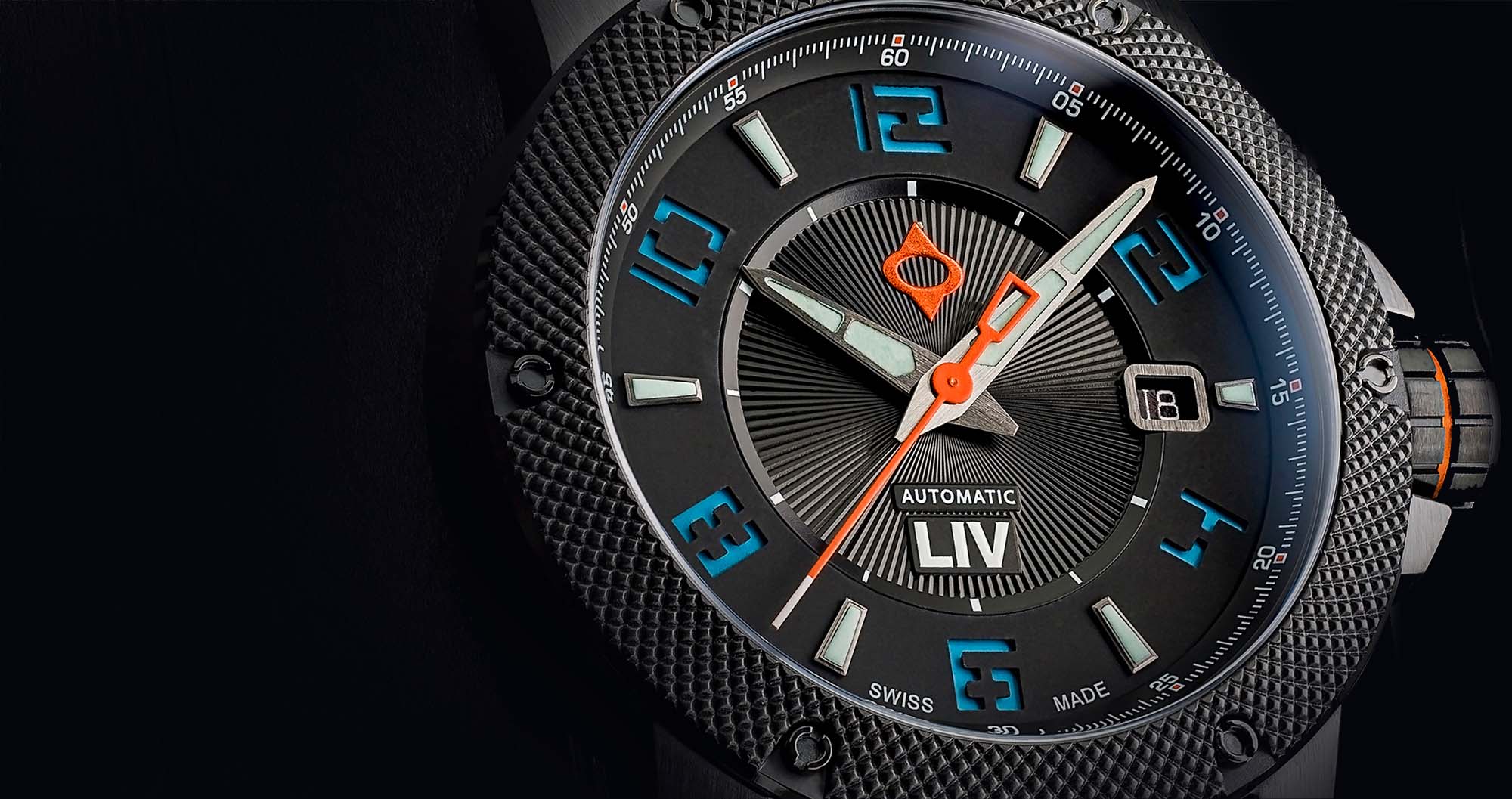 and skeleton case-back, knurled bezel with screws, and screw-down crown with LIV logo enamel