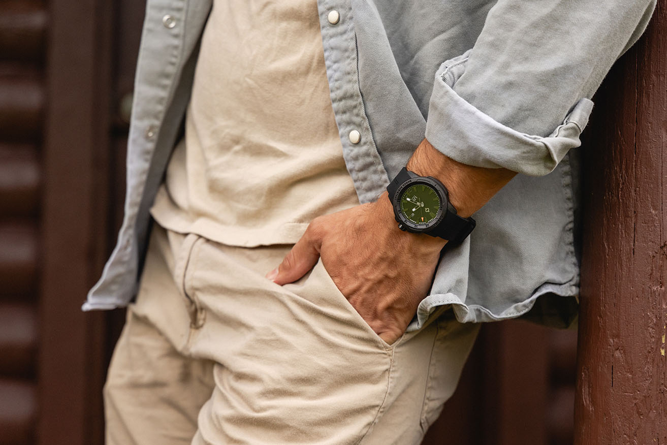 We use a mix of carbon fiber and polyamide that we call Dense Carbon. This case is super durable, tough, and light–the perfect watch case for the outdoor.