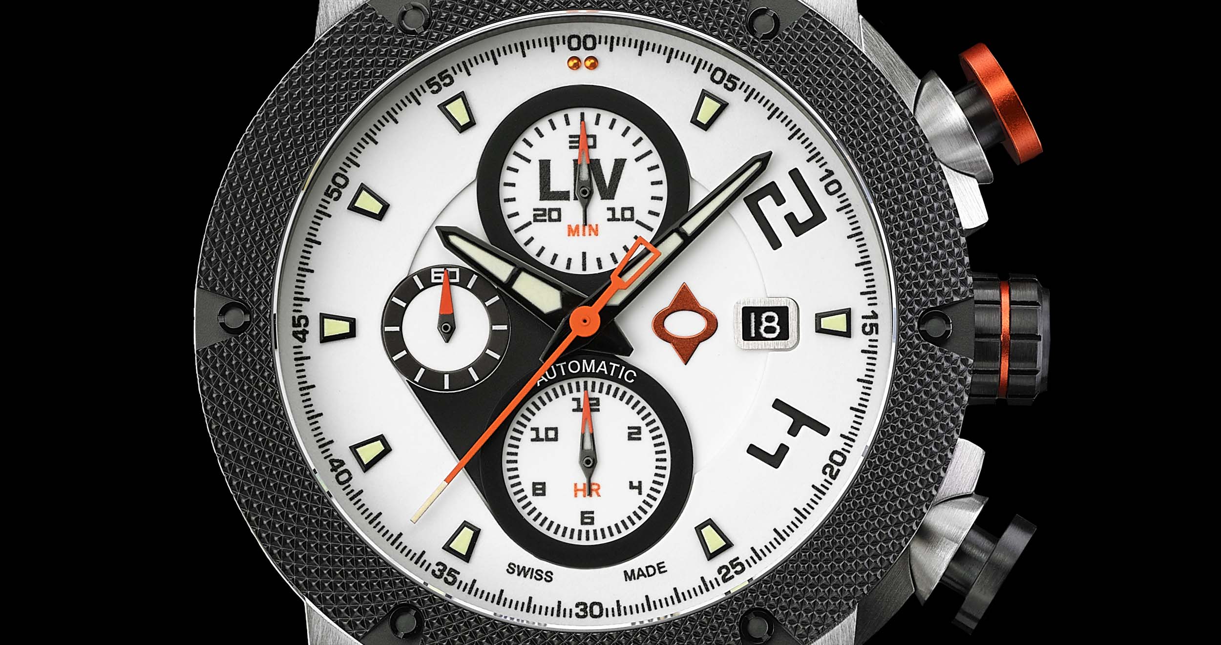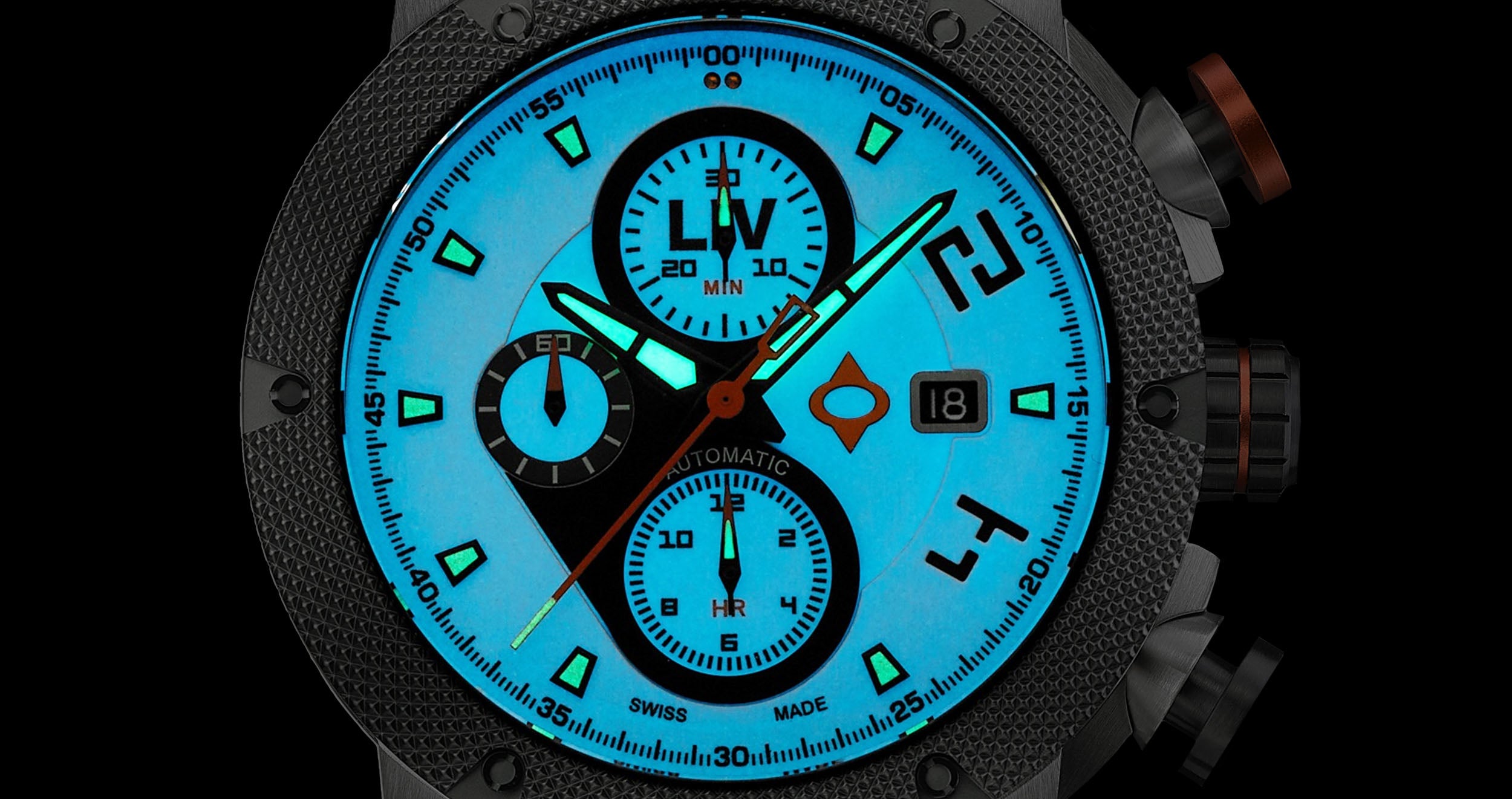 and skeleton case-back, knurled bezel with screws, and screw-down crown with LIV logo enamel