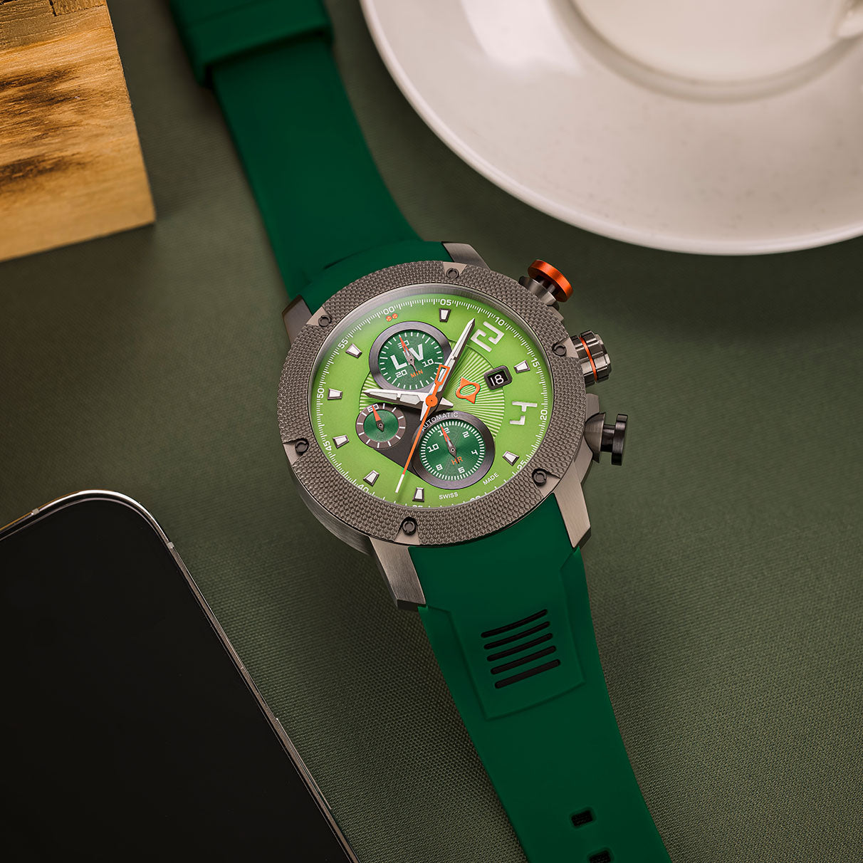 Surgical grade 316L stainless steel infused with gray IP and skeleton case-back, gray knurled bezel with screws, and screw-down crown with LIV logo enamel
