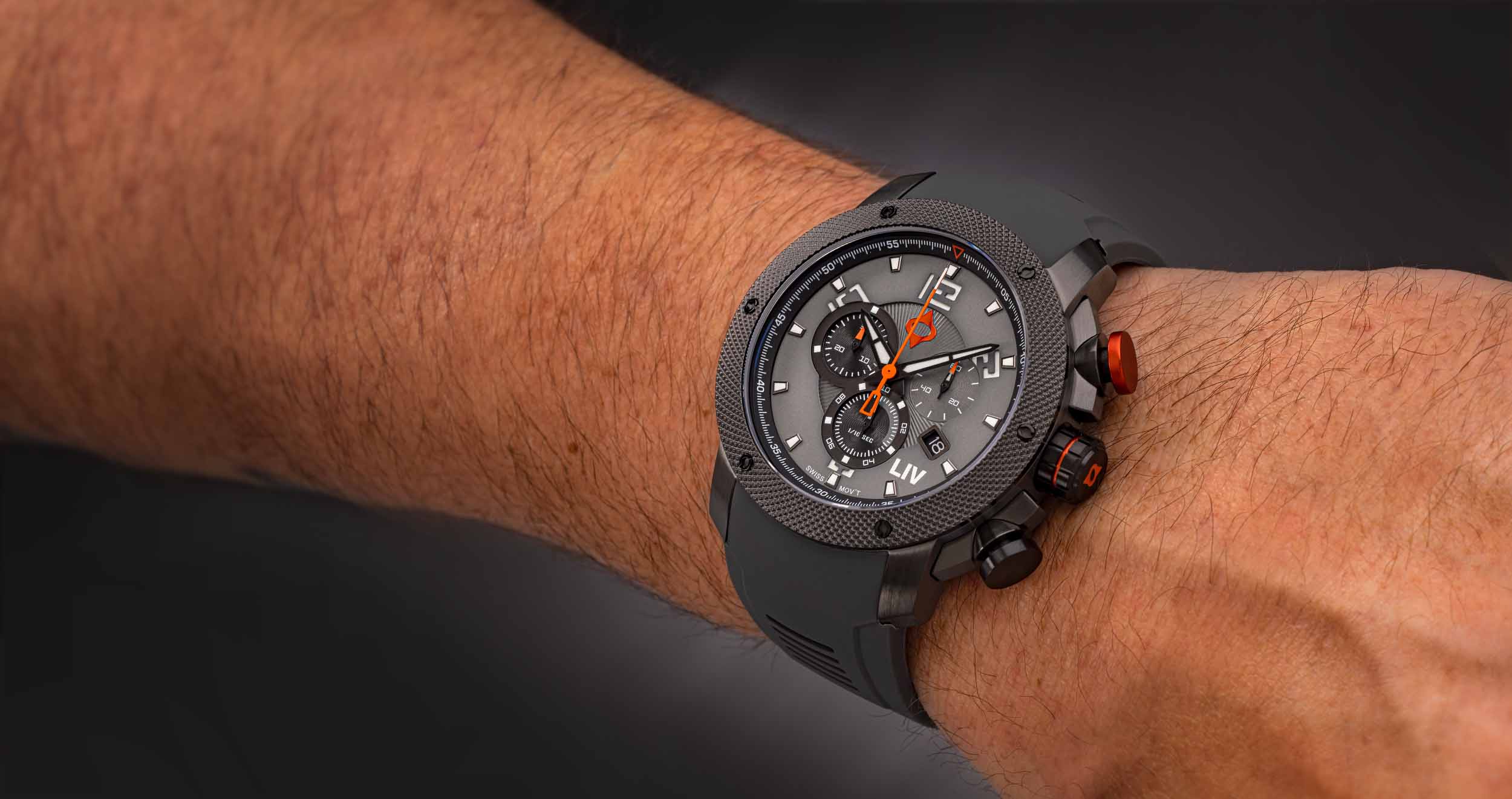Surgical grade 316L stainless steel infused with gray IP for beautiful color and durability, screw-down case-back, gray knurled bezel with screws, and screw-down crown with LIV logo enamel