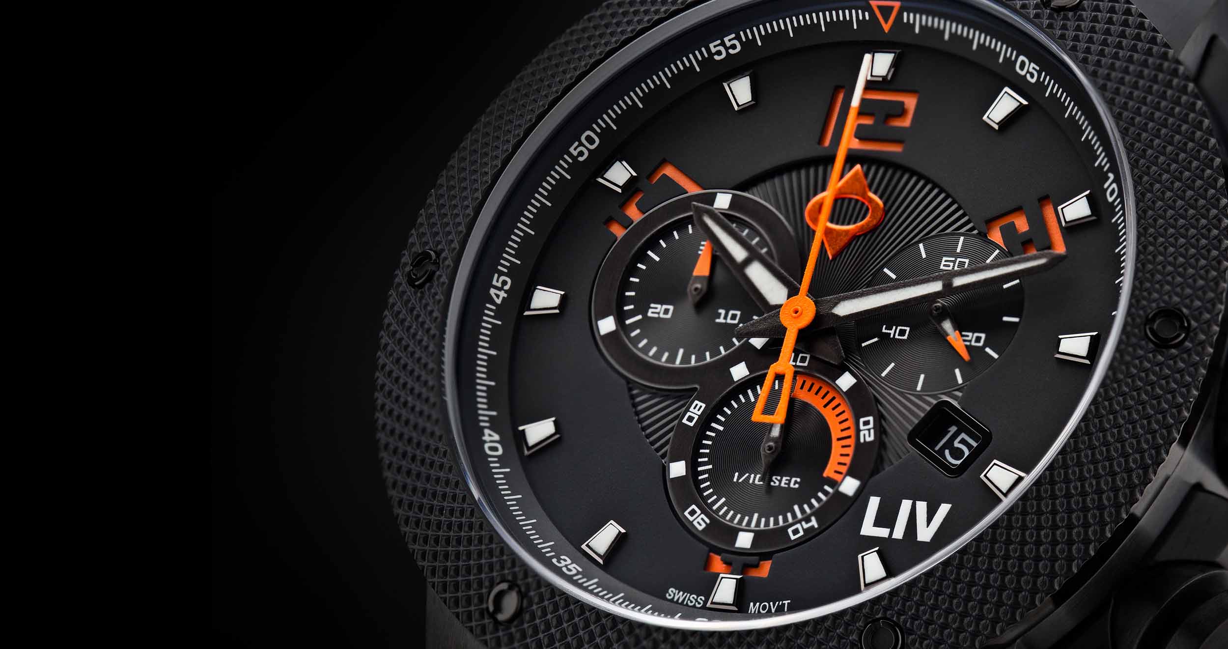 Surgical grade 316L stainless steel infused with black IP for beautiful color and durability, screw-down case-back, black knurled bezel with screws, and screw-down crown with LIV logo enamel