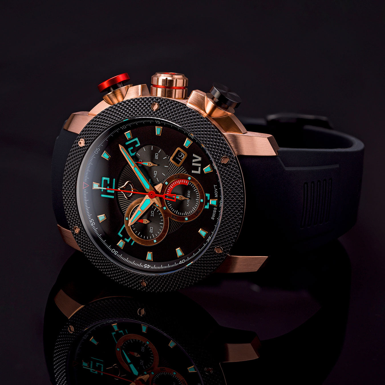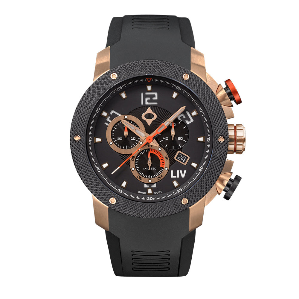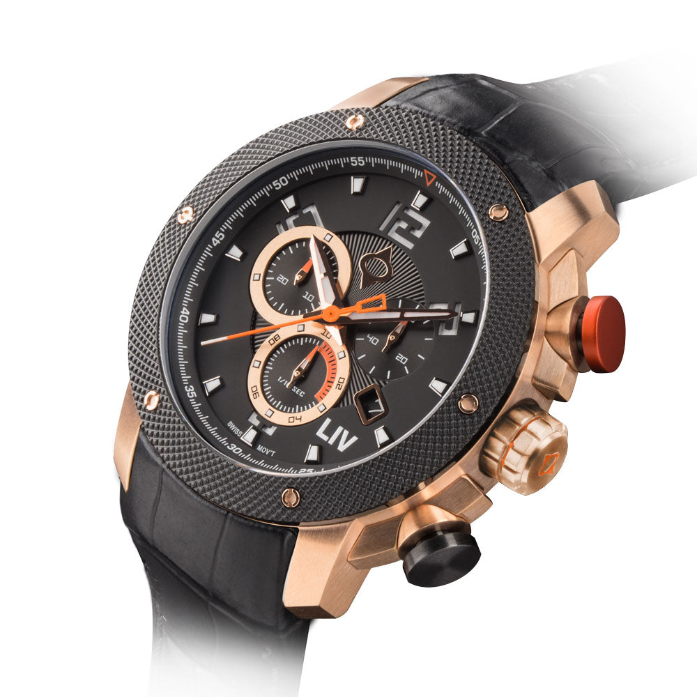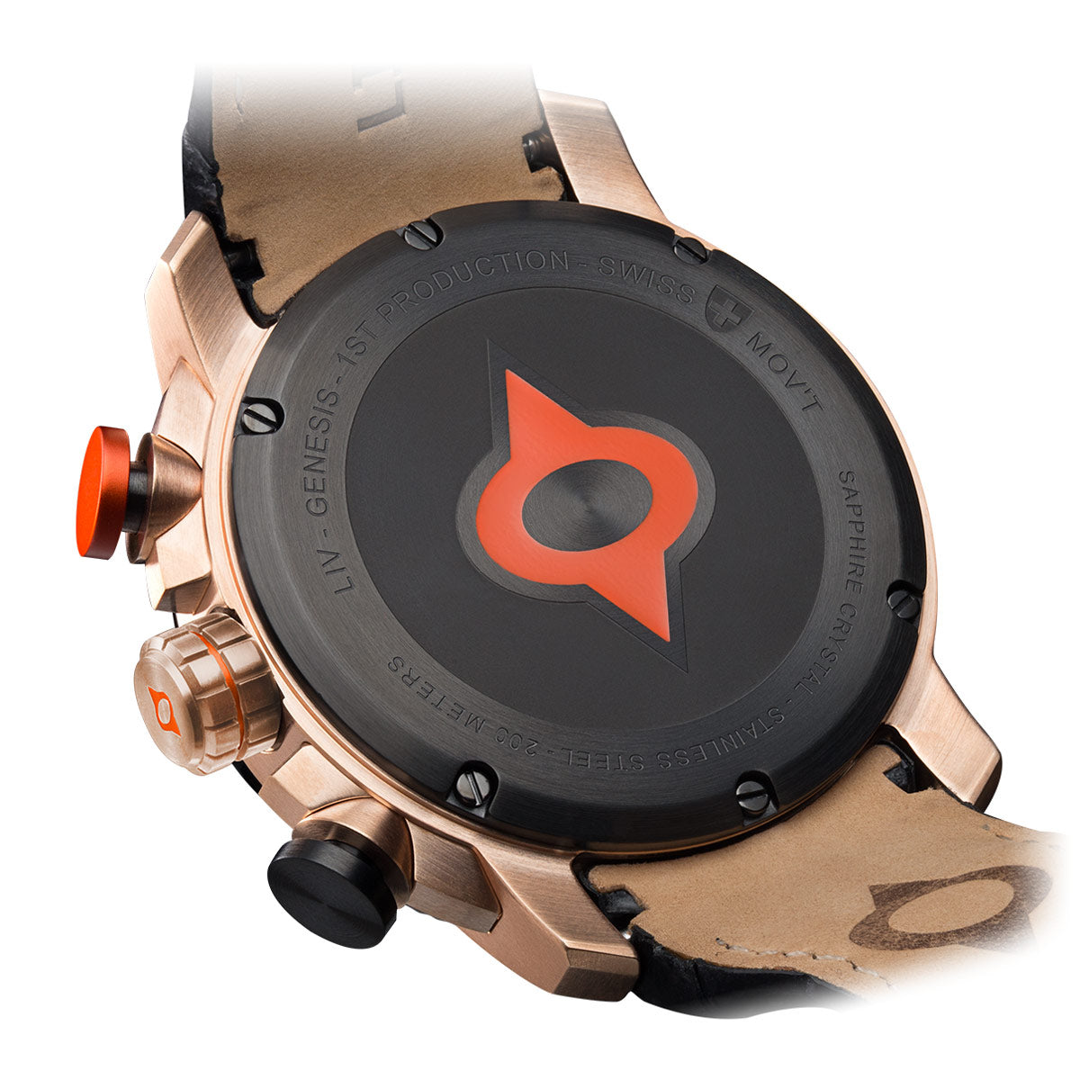 Surgical grade 316L stainless steel infused with rose IP for beautiful color and durability, screw-down case-back, black knurled bezel with screws, and screw-down crown with LIV logo enamel