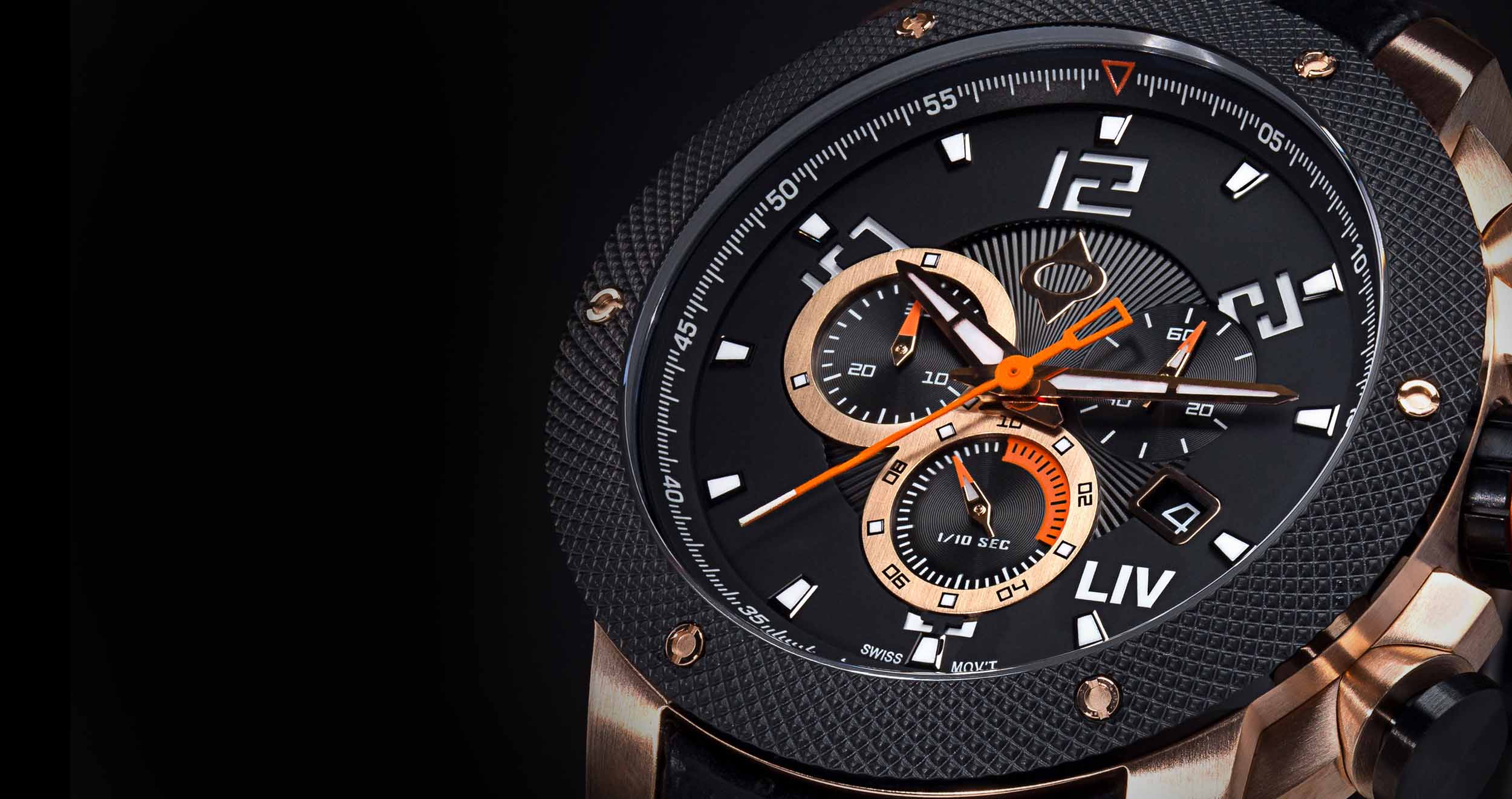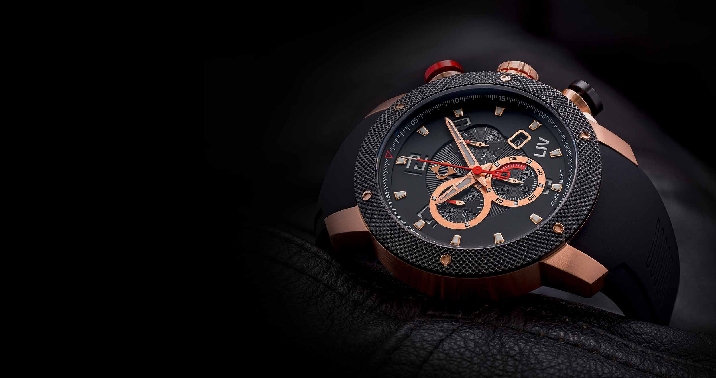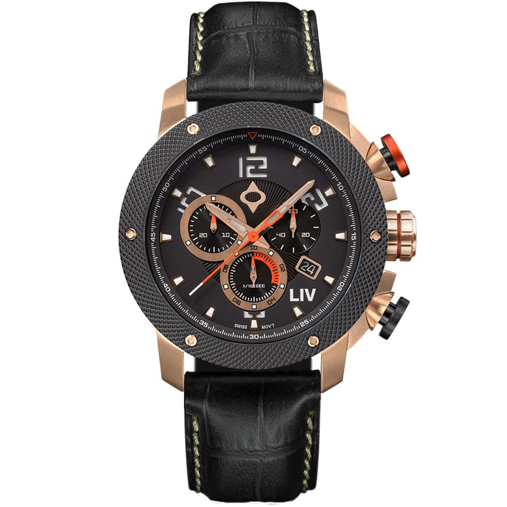 Surgical grade 316L stainless steel infused with rose IP for beautiful color and durability, screw-down case-back, black knurled bezel with screws, and screw-down crown with LIV logo enamel
