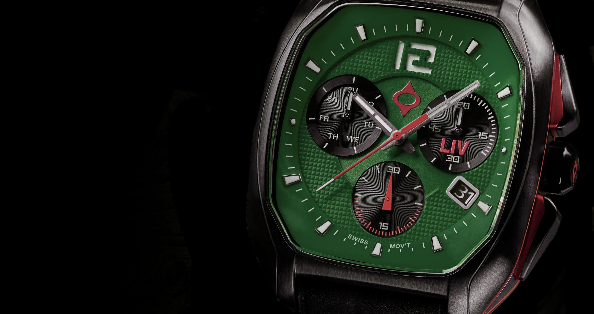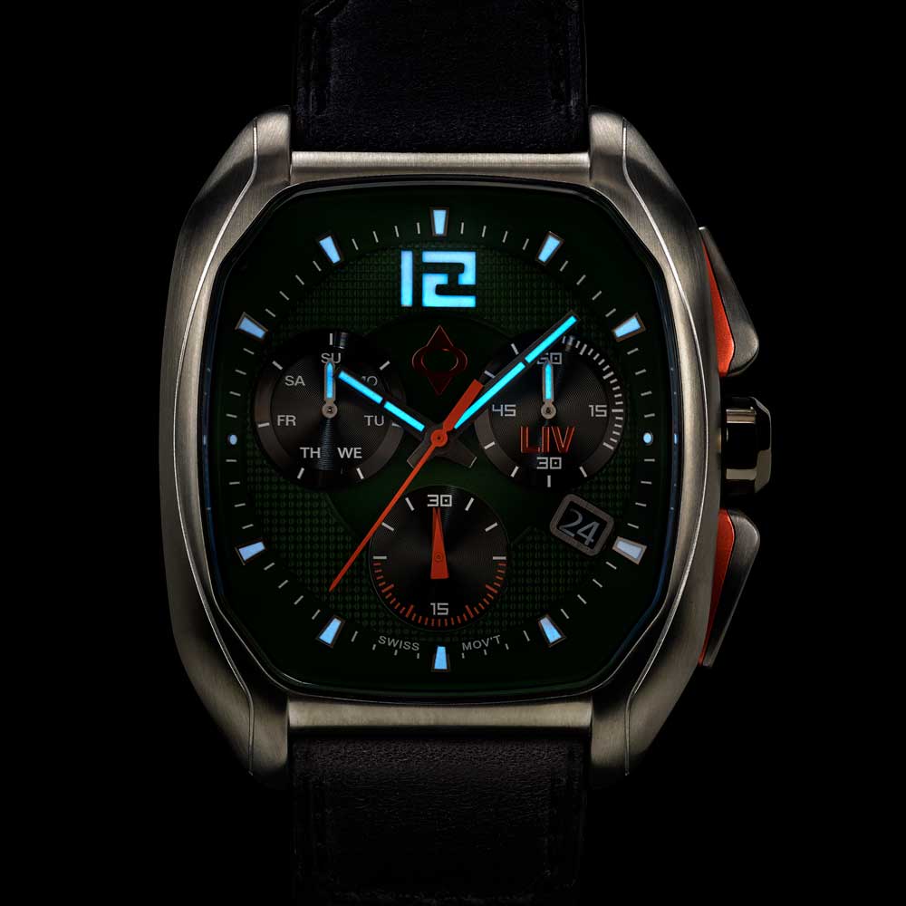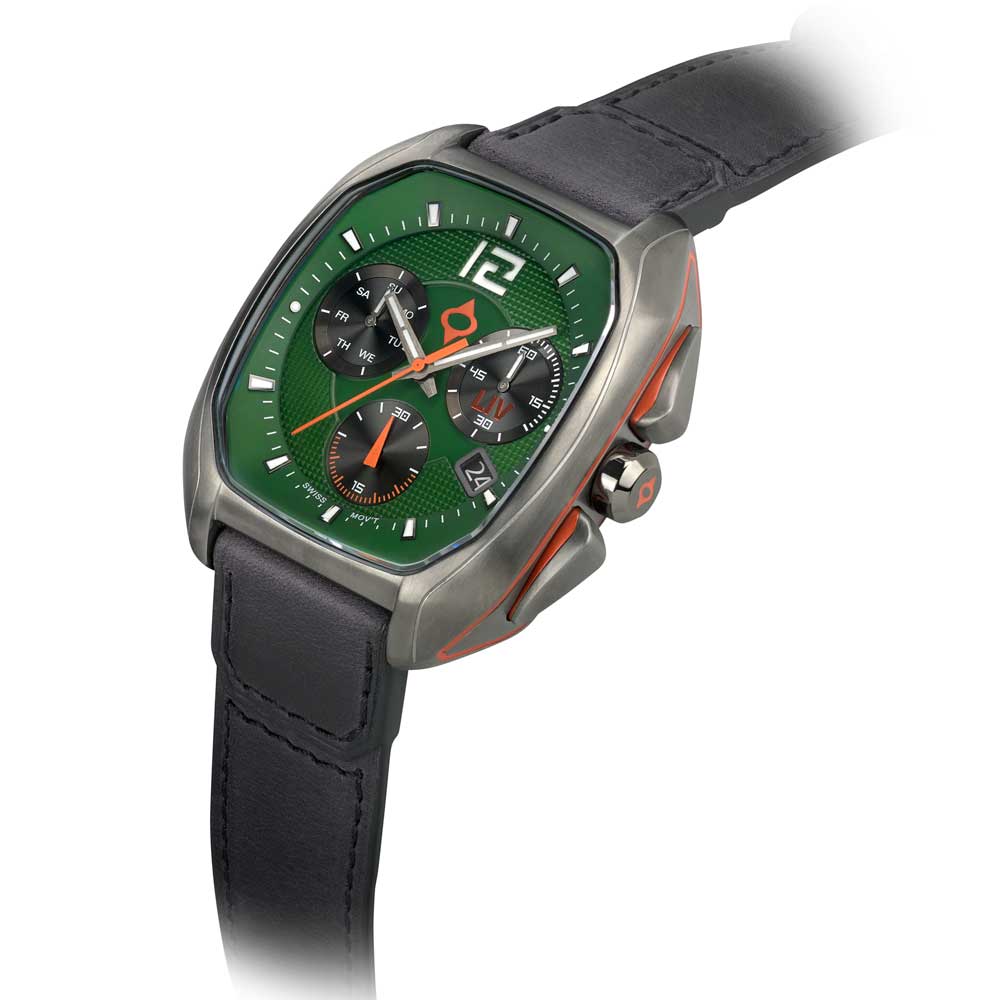 100% Swiss Made. Caliber Z60, Swiss Day-Date chronograph, fully adjustable hands, 3-5 year battery life, with EOL indicator