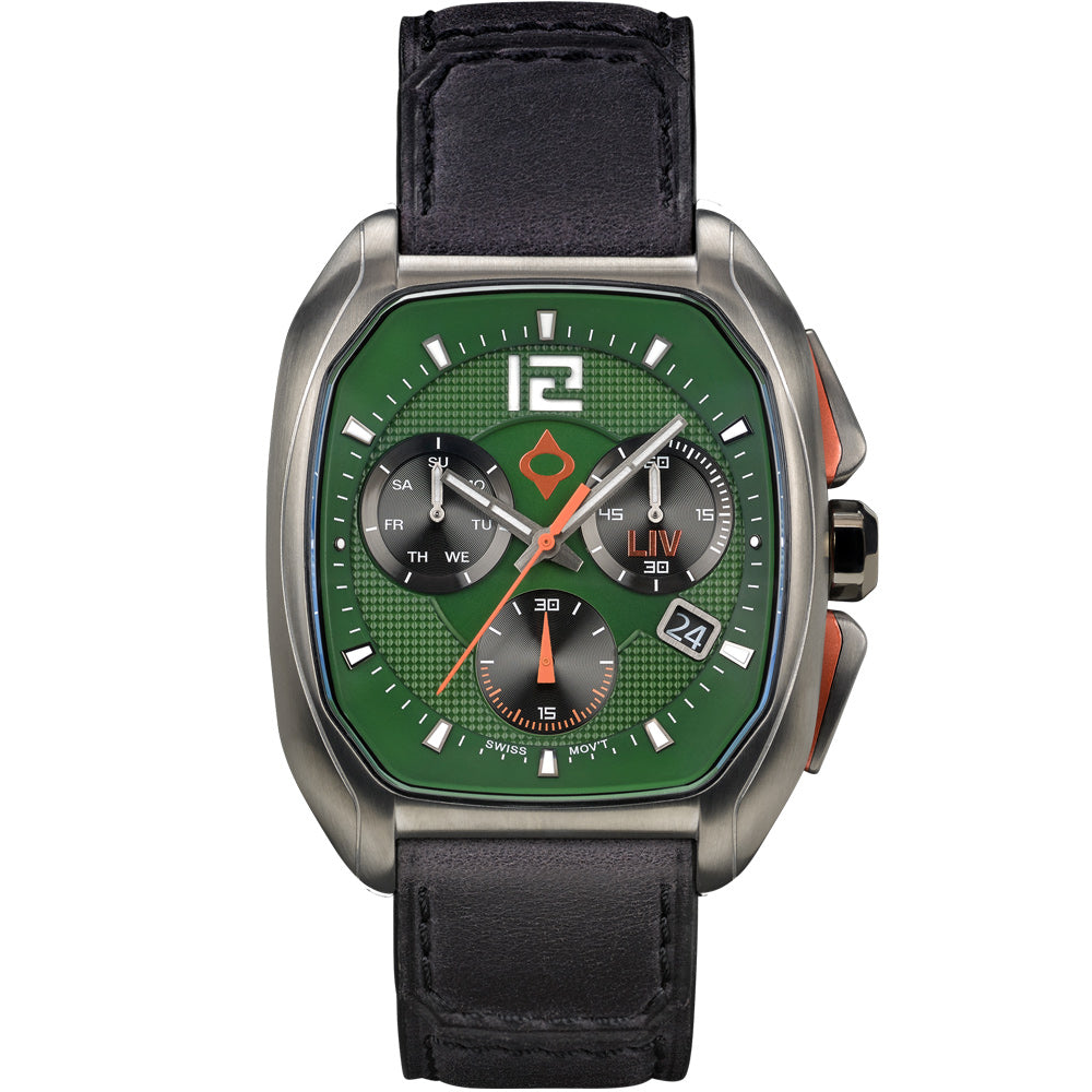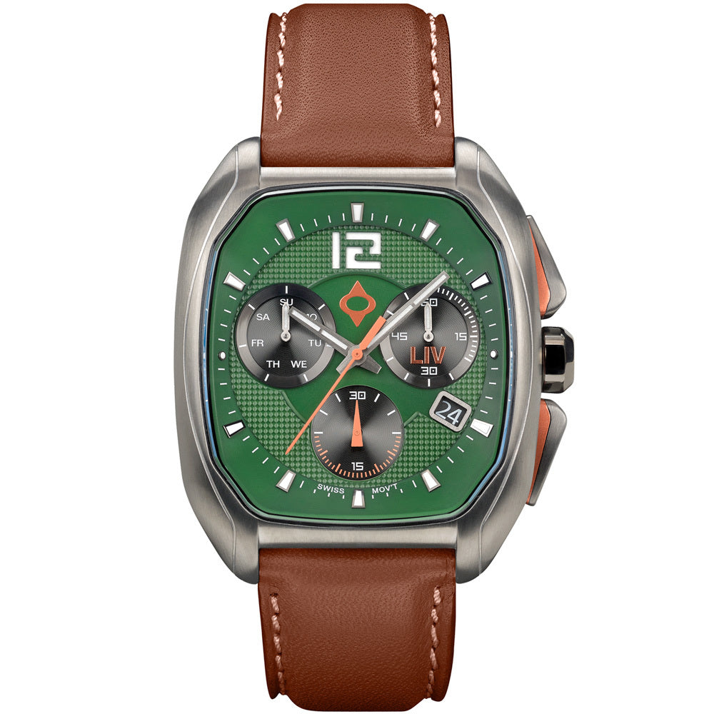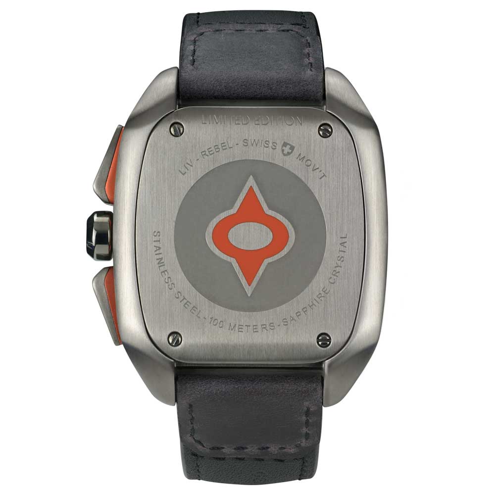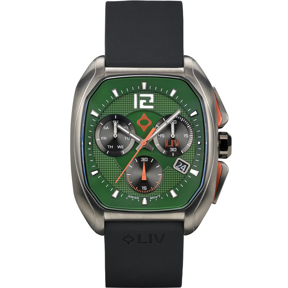 Surgical grade 316L stainless steel infused with gray IP curved design and push in crown and LIV logo enamel