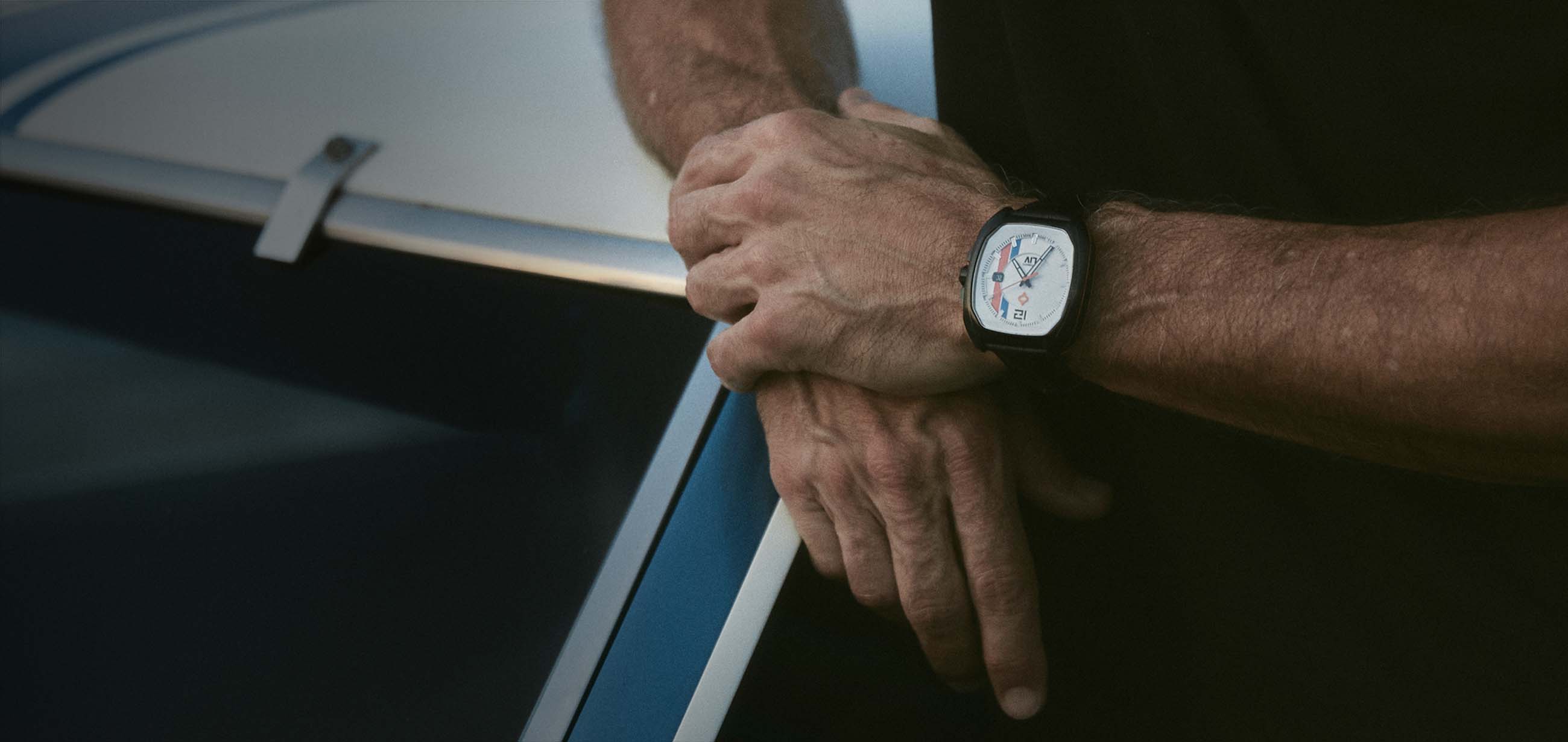 Embodies all the unique design features of the Rebel-AR but adds the precision Swiss automatic movement. The colored strips pays homage to the days of classic car racing.