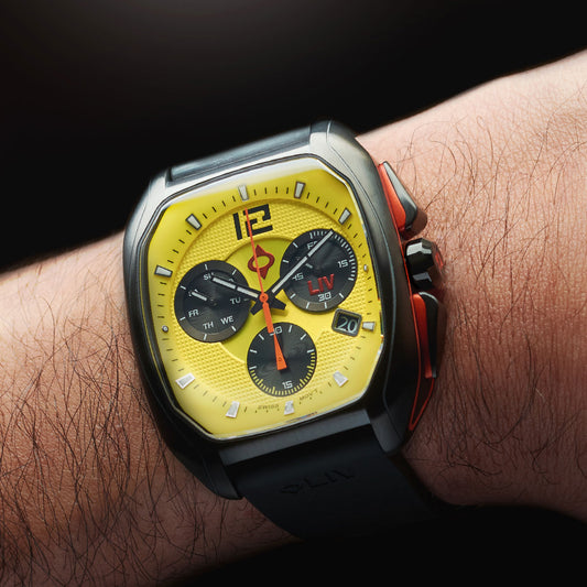 Disregarding all conventional watch designs and regular patterns, this watch is rectangular and round simultaneously. The unique stadium concave ring starts at a rectangular shape and becomes round, making this watch one of a kind.